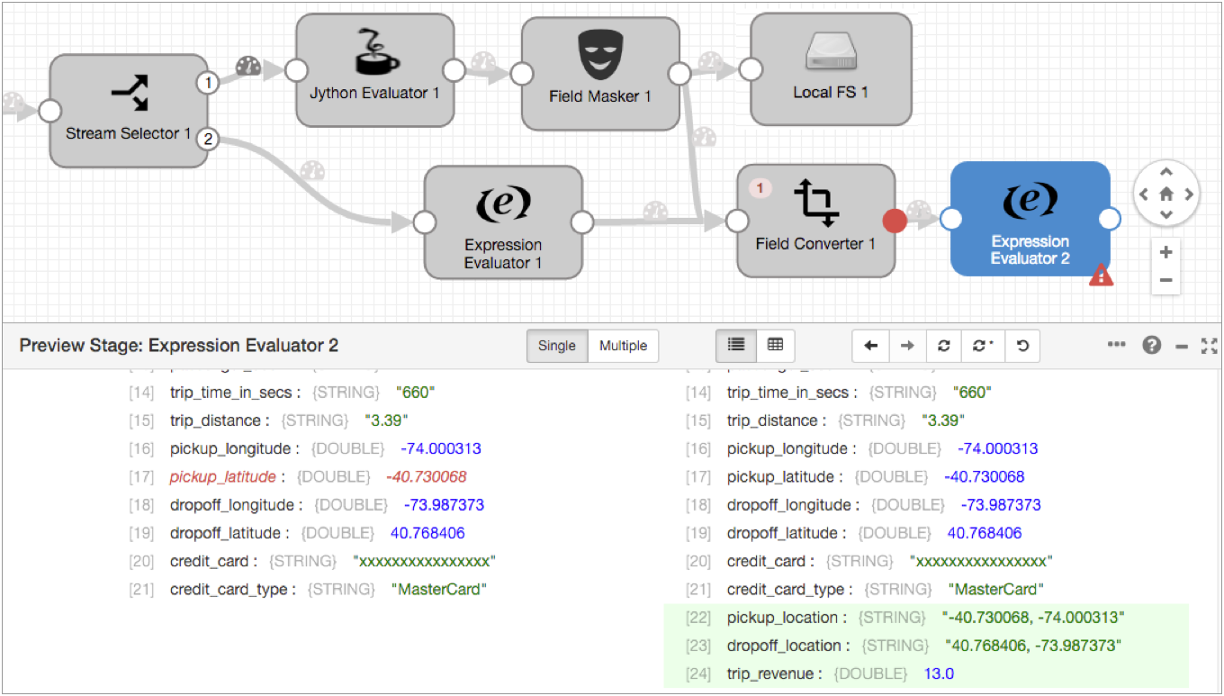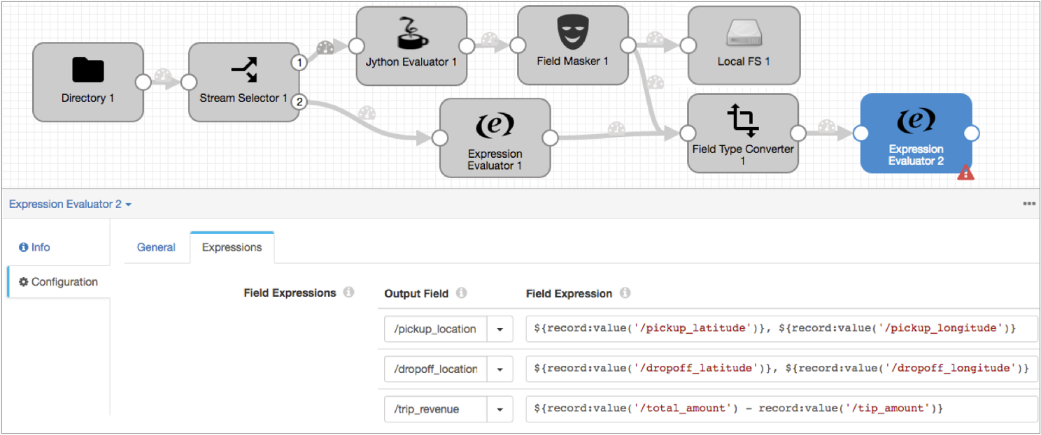 Now we'll use an Expression Evaluator to create pickup and dropoff location fields that merge the latitude and longitude details. We'll also calculate the basic trip revenue by subtracting the tip from the total fare.