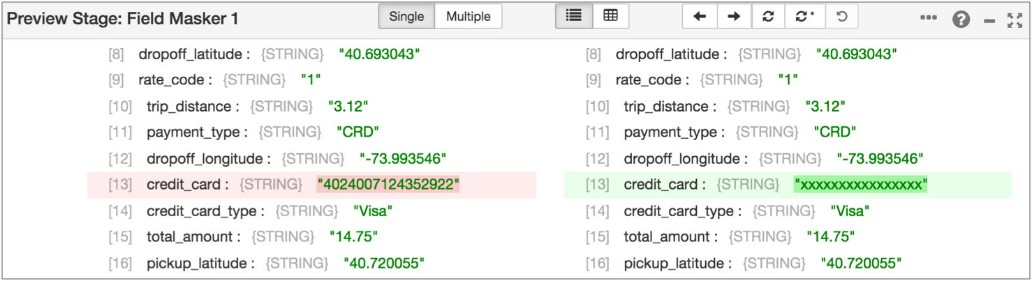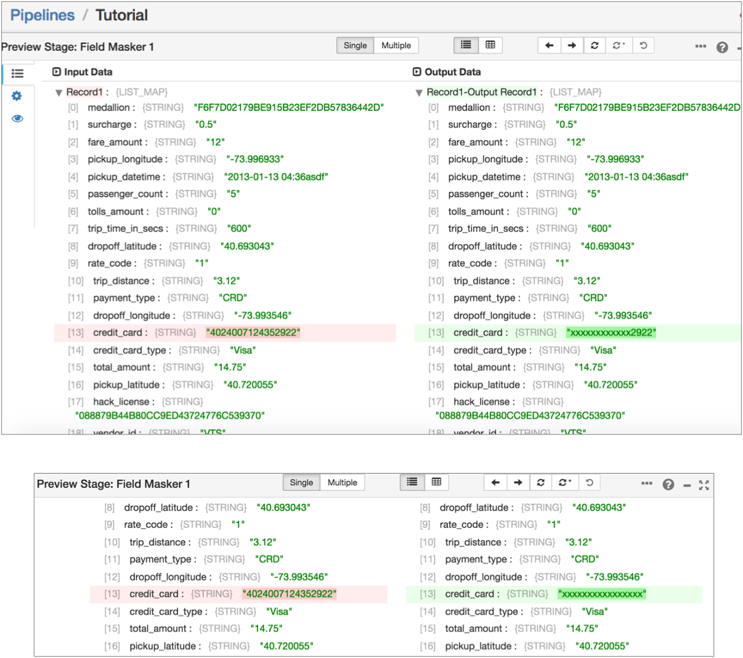 The Data Collector runs the preview with the change. Notice the corresponding output record now has -40.730068 for both pickup_latitude and pickup_location.